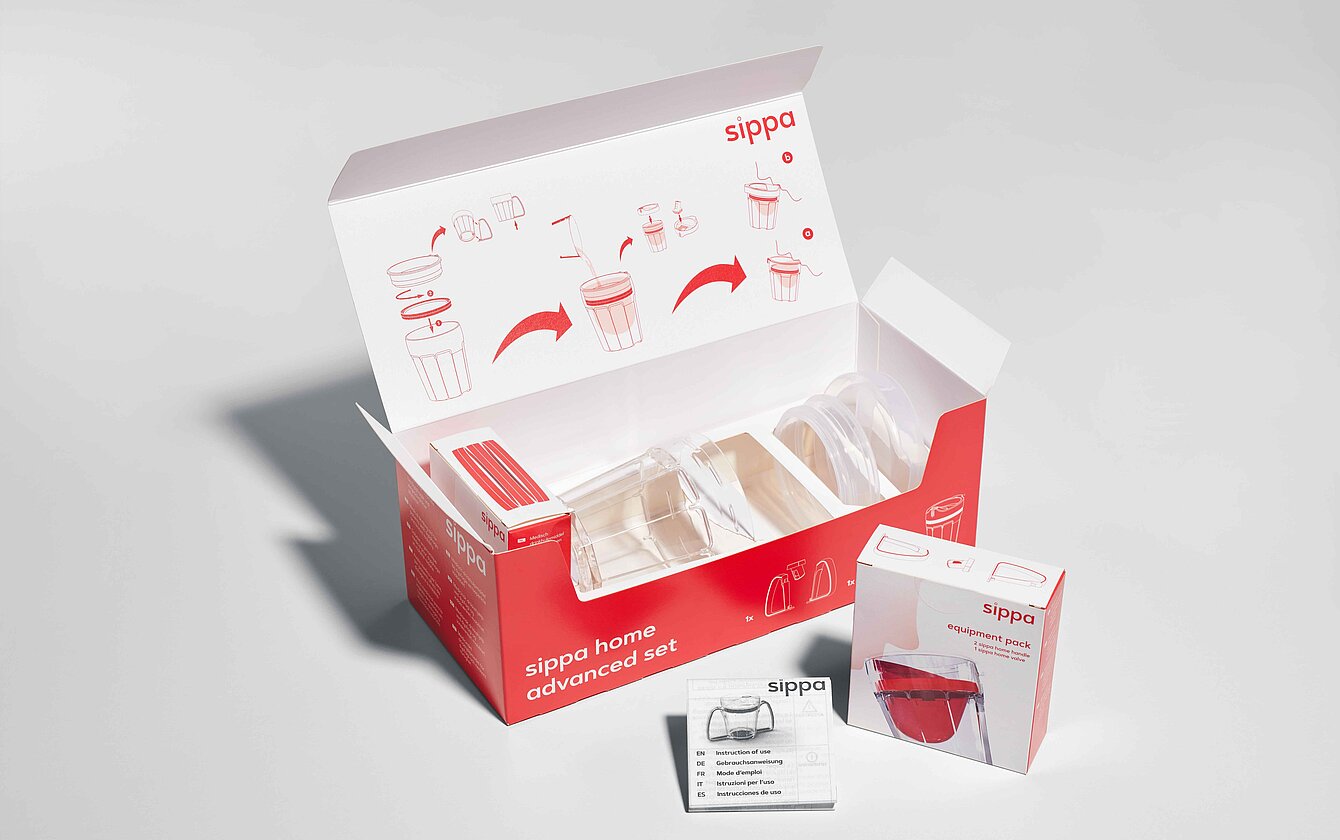sippa besteht aus vielen unterschiedlichen Komponenten, die in einer Verpackung vereint und untergebracht werden mussten. Dieser Prozess erwies sich als äußerst komplex: Unter anderem galt es, die ideale Passform für die Gebrauchsanweisung in der Faltschachtel zu finden und Inlays für eine bestmögliche Produktpositionierung zu gestalten. Die Sicherheit des Trinksystems beim Transport war ebenfalls ein wichtiges Kriterium. Außerdem herrschte aufgrund der terminierten Produkteinführung ein hoher Zeitdruck, so dass Lieferzeiten und Lieferketten für alle Verpackungskomponenten engmaschig abgestimmt werden mussten.