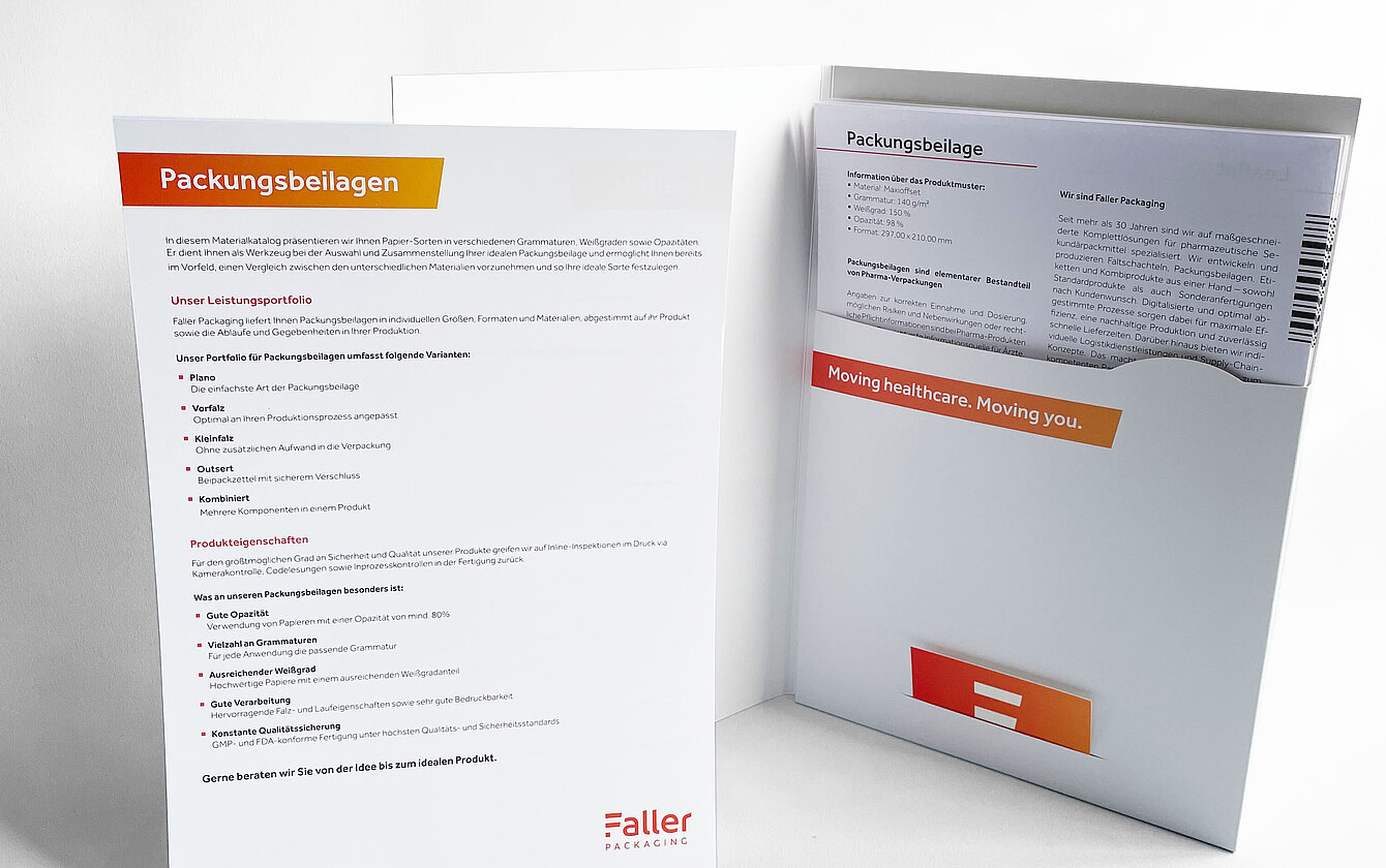 Which grammage fits? Unfolded leaflet, or would it be better pre-folded or small folded? Should the leaflet be closed or have an index? Or perhaps several of these options combined? There are many ways to create the best possible design for patient information in a pharmaceutical product. To help customers find the ideal leaflets for their products, Faller Packaging has now made its new material catalogue for leaflets available.